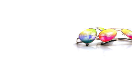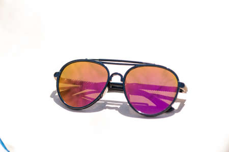 Sunglasses with colored lenses on a white background. Selective focus.