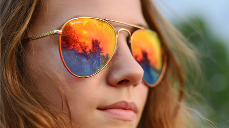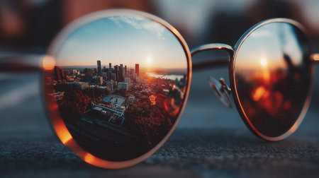A captivating close-up image of stylish sunglasses reflecting an urban sunset. The vibrant colors and city skyline create a stunning visual contrast against the twilight sky.