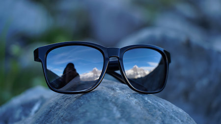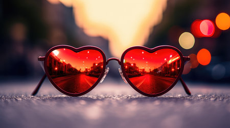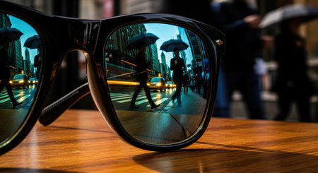 Stylish sunglasses reflecting an urban scene in their lenses. Modern and trendy composition highlighting fashion and city lifestyle.