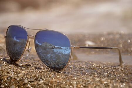Sunglasses at the beach with sea reflection. Holidays, travel, vacation and happiness concept.