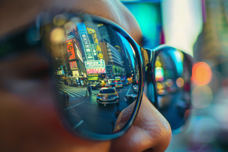 The reflection in sunglasses shows the lively atmosphere of Times Square, with bright signs and busy traffic, as dusk settles over New York City.