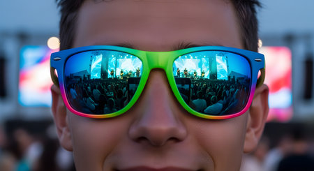 A close-up shot of a man wearing colorful, rainbow-framed sunglasses with mirrored lenses. The lenses reflect a bright concert stage with a band playing and the crowd watching, capturing the atmosphere of a live music festival.