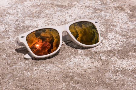 Sunglasses with reflection on water at sunset background - Vintage Filter