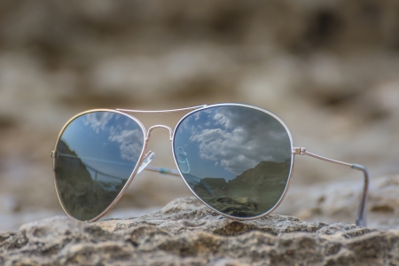 The beach is reflected in sunglasses