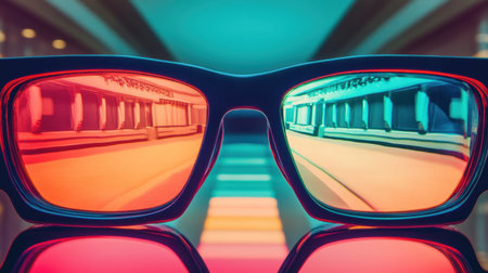 Close-up view of vibrant sunglasses reflecting a colorful urban pathway, showcasing artistic design and modern architecture elements in bright hues.