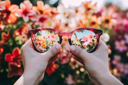 Blossoming moments: A Captivating Shot of a Hand Adorned with Eyeglasses Amidst Vibrant Flowers