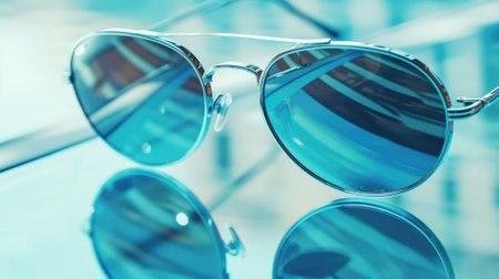 Close-up of blue-lens sunglasses with reflections on blue-toned background