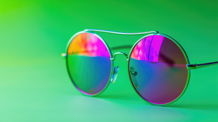Round tinted sunglasses with reflective lenses on green background