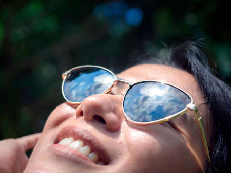 Summertime. Smile with the sun. Close up of sunglasses with blue sky reflection wearing by beautiful Asian woman face smiling and look up to the hot sunshine.