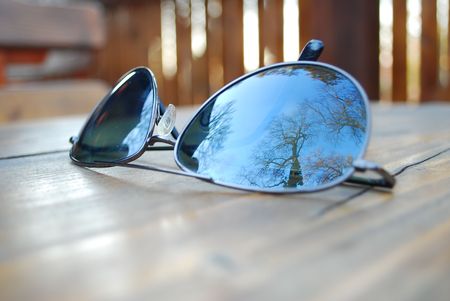 a pair of sun glasses on a wooden table reflecting a tree in autumn