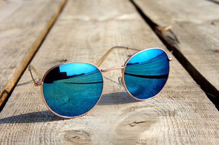 fashionable mirror glasses with blue glasses on the sun lie on a wooden floor rest trip reflected in glasses