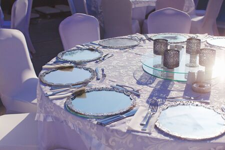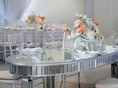 Table served for wedding banquet with cutlery and flowers in vases. Transparent glasses and mirrors as decorations.