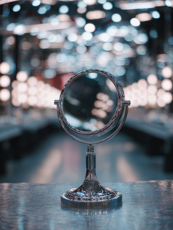 A silver mirror with a unique, ornate design, placed on a polished wooden surface, reflecting soft, ambient light