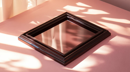 An elegant wooden picture frame with a reflective surface rests on soft pink fabric, surrounded by ambient light and gentle shadows, creating a tranquil atmosphere.
