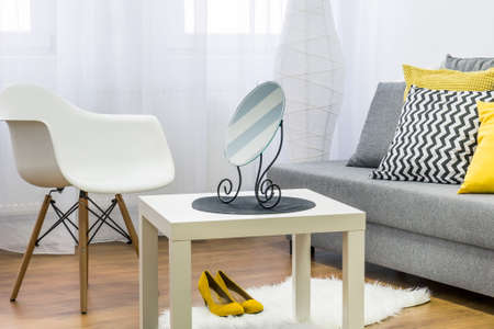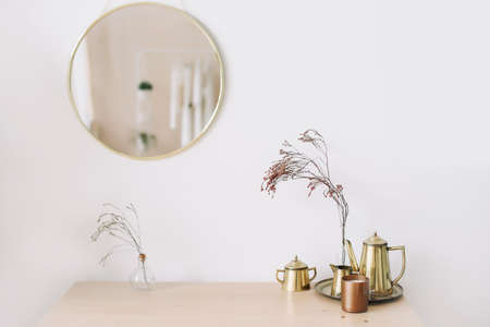 Home interior with decor element. Scandinavian minimal interior. Interior design elements. Flat lay, top view