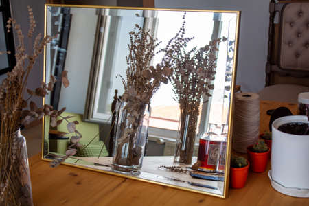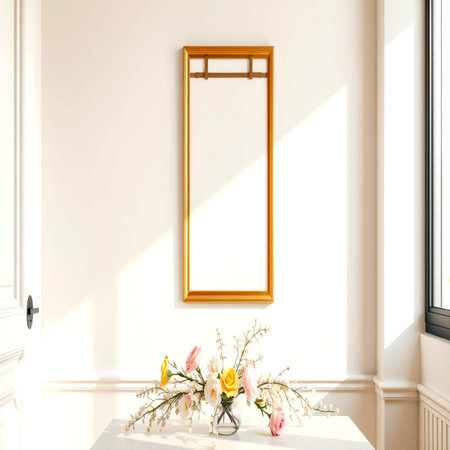 This captivating image showcases a cozy interior scene with a vintage mirror and vibrant flowers in various vases, beautifully illuminated by natural light.