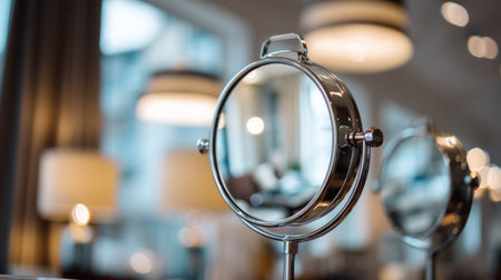 A stylish round makeup mirror reflecting a beautifully designed interior with soft lighting. Ideal for enhancing beauty routines and decor.