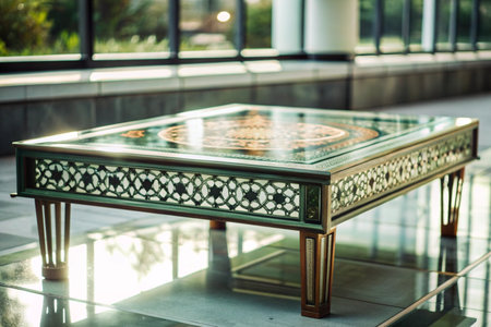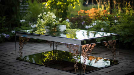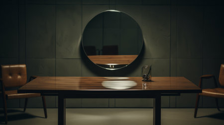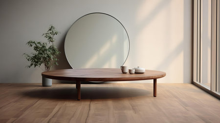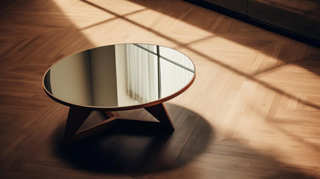 the minimalist table stands elegantly in the center of the room, surrounded by the subtle reflection of a floor mirror, creating a sense of simplicity and sophistication, while the close-up shot highlights the clean lines and sleek design of the modern furniture, evoking a feeling of calmness and serenity in the minimalist interior space. ai generated