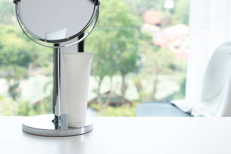 Wooden dressing table with mirror, cream, vase and tissue box by the white curtain window in contemporary tropical resort