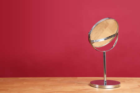 Vintage style makeup mirror on wooden table with space on blue wall background, pink vintage table mirror