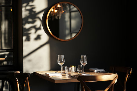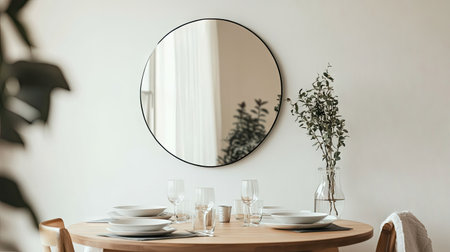 Minimalist restaurant dining area with round mirror and houseplants in natural light. Modern dining table with sunlight, a round mirror, and minimalistic houseplants. Modern cafe interior.