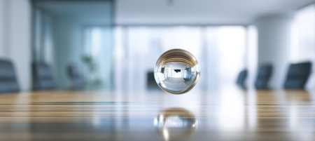 A glowing crystal sphere hovers above a boardroom table, its light reflecting off frosted glass and creating a mesmerizing effect as the reflections gently shift left and right.