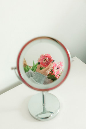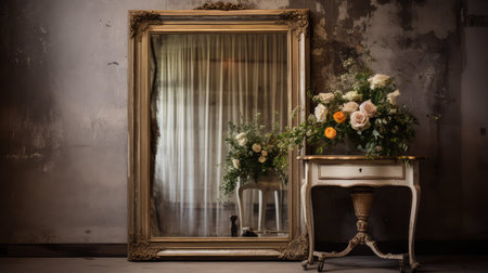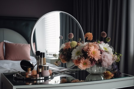 A silver-framed mirror stands on a white wooden surface. Softly lit, the image showcases a close-up of the mirror and surrounding objects, including a bouquet of pink and peach flowers. The arrangement evokes a sense of tranquility. It is suitable for design, decorative, or lifestyle projects.