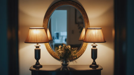 Aerial view of a pair of matching table lamps on a console table, framing a large mirror.