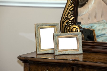 Blank wooden photo frame stands in the interior on a white background. Mockup poster frame.
