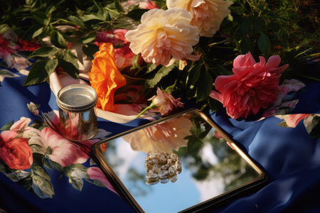 Natures Reflection: Flowers and a Mini Mirror Adorned on a Scenic Outdoor Blanket