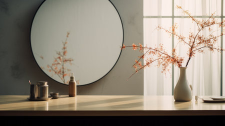 white bathroom with flowering trees and mirror, featuring an earth tone color palette. this tabletop photograph showcases a minimalistic japanese style, with a combination of light orange and dark black hues. the image is captured in high quality, 8k resolution, creating a lively tableau of tranquility and simplicity. ai generated