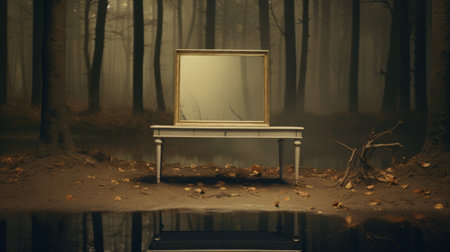AI Generated. A mirror reflecting the beauty of a forest on a wooden floor