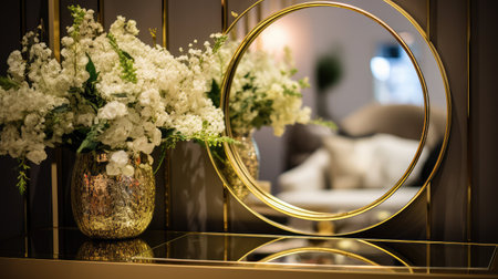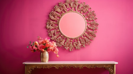a stunning 8k resolution photo featuring a tondo mirror surrounded by dark red and light bronze furniture. the minimal retouching enhances the photorealistic details, showcasing the mid-century style. with ray tracing technology, this image captures the essence of elegance and sophistication. ai generated