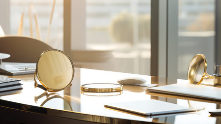 A frameless mirror resting on a minimalist desk, capturing the soft glow of ambient light in a clean environment.