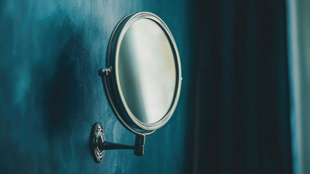 Round mirror against a blue and black wall. Space for text. The concept of emptiness. Copy space