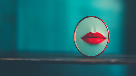 Striking red lips are perfectly reflected in an oval mirror, set against a soft, teal-blue background. The image evokes themes of beauty, self-awareness, and the intimate act of applying makeup, creating a mood of sophisticated allure and personal expression.