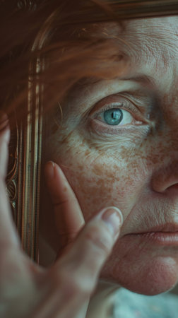 This close-up portrait captures a young woman's natural beauty and freckles as she gazes thoughtfully into a mirror, revealing her emotions in soft, warm light.