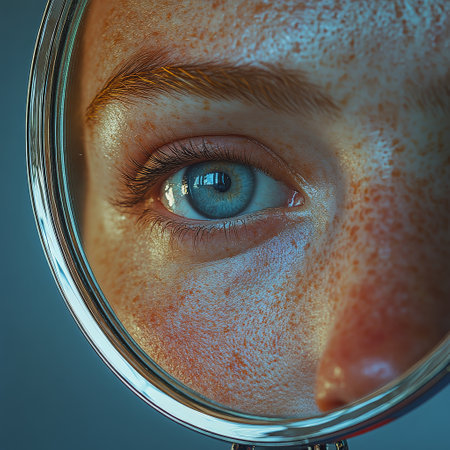 Woman examining skin with freckles in magnifying mirror reflecting blue eye