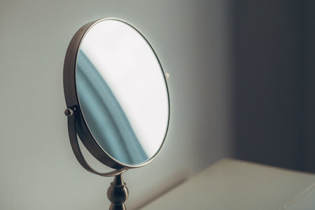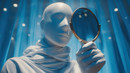 Male figure is looking into a round mirror, capturing a moment of reflection and self-discovery, with warm tones enhancing the emotional depth of the scene, AI generated