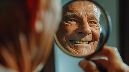 Smile transformation: Man admires his new dental implants in mirror, reflecting confidence and satisfaction with his oral health