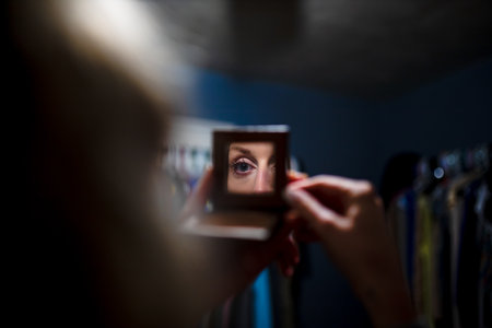 A close-up view of a person gazing into their reflection in a mirror, capturing the details of emotion and introspection. Light and color enhance the serene moment.