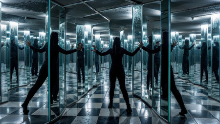 Woman dressed in dark clothing navigates a reflective mirror maze, her figure repeatedly reflected in the glass walls