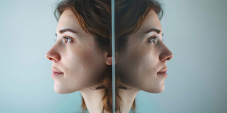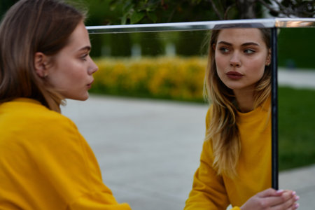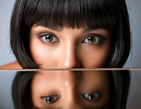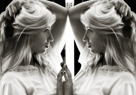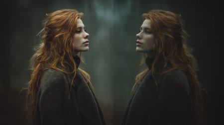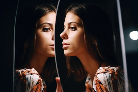 cropped shot of an attractive young woman looking at an inverted image in a mirror, created with generative ai