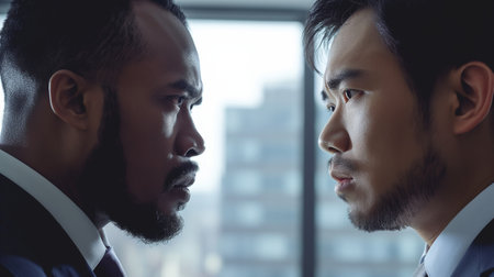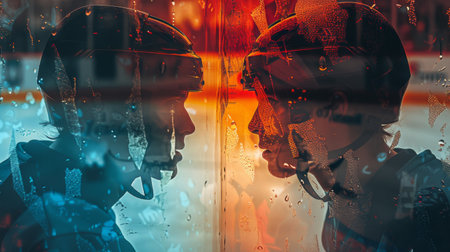 Two distinct figures are depicted facing each other in a contrast of light and shadow. Their profiles create a striking visual composition of connection and confrontation.