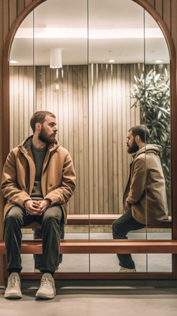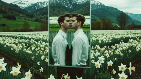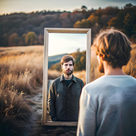 A man stands before a rustic wooden mirror. gazing at his reflection in a field of tall grass. The image evokes introspection and self discovery. with a sense of mystery and contemplation.