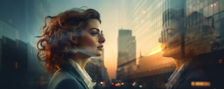 A woman gazes through a window, her reflection distorted by the cityscape behind her, creating a mesmerizing and ethereal image.