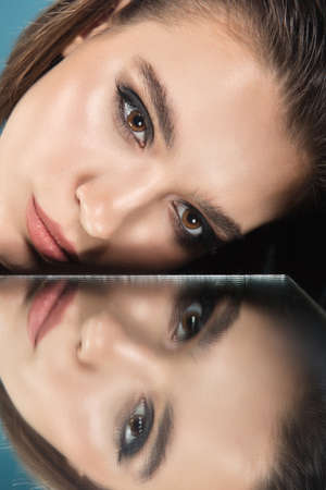 On the water. Portrait of young female fashion model with reflection on mirrors around her face. Beautiful caucasian woman with trendy make-up and well-kept skin. Style and beauty concept. Close up.