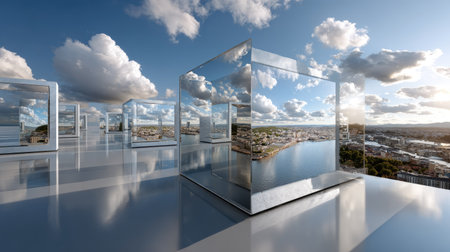 A stunning futuristic urban landscape featuring reflective cubes that capture scenic river views under a bright cloudy sky. This modern design evokes tranquility and innovation.