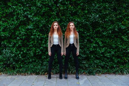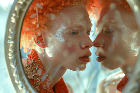 A person with albinism and orange colored hair gazing at their reflection in a mirror. International Albinism Awareness Day concept.