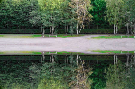 Peaceful calm lake reflection of shore and trees at Loch Lomond